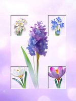 Dit kleurrijke digitale kunstwerk is een harmonieus eerbetoon aan de lente in vijf bloemenportretten. In het midden staat een weelderige hyacint met zacht gebogen blauwpaarse bloesems, die oprechtheid en vrede symboliseren. De vier zijpanelen tonen verschillende lentebloemen met elegante detaildiepte.