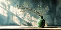 Een serene en contemplatieve kunstfoto die de vergankelijkheid van de natuur weergeeft. Een gestileerde, dode tak in een vaas met kleine gele bloesems staat in contrast met de vervormde, dromerige schaduw van Arabische tekst op de muur. Het beeld nodigt uit tot reflectie over de cyclus van leven en dood, met een ondertoon van mysterie en symboliek.