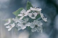 Gefotografeerde witte bloesem van een fruitboom in vintage stijl bewerkt met een zachte bokeh. Blauw grijze wazige achtergrond met een zweem van witte onscherpe bloesem.