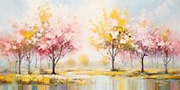 "Lentebries aan het Water" vangt de essentie van de lente met haar levendige, vernieuwende energie. In deze digitale creatie weerspiegelen de zachte roze, witte en gele tinten van de bloesemende bomen de hoop en het nieuwe begin dat elk voorjaar brengt. De reflectie op het wateroppervlak, getint met flarden van deze tere kleuren, voegt diepte en rust toe, waardoor een serene atmosfeer ontstaat die de zintuigen kalmeert.