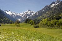 In het hart van het Trettachtal, vlakbij Oberstdorf, ontvouwt zich een voorjaarsmagie die zijn weerga niet kent. De weiden zijn uitgespreid als een groen tapijt, bezaaid met heldere bloemen en het delicate wit van paardenbloemen. Een enkele boom staat als een stille schildwacht te midden van het weelderige groen, terwijl de majestueuze Trettachspitze uittorent aan de horizon - 2595 meter hoog, ruig maar sierlijk, bekroond met sneeuw die weigert te wijken, zelfs in de lente.