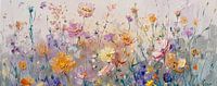 e compositie bestaat uit een weelderige verzameling veldbloemen in zachte pastelkleuren, variërend van lichte paarstinten en roze tot warme geeltinten en oranje accenten. De schilder heeft gebruikgemaakt van een…
