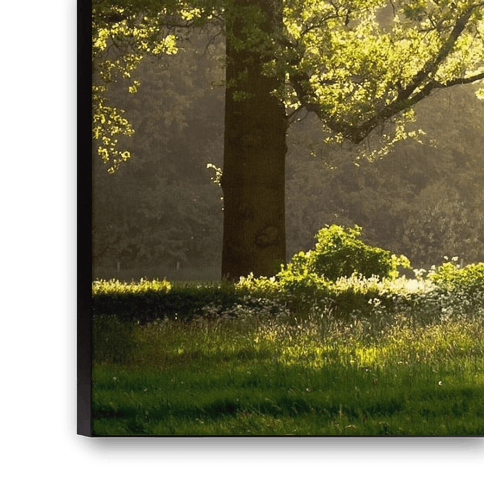 Een bomenrij in Amelisweerd (Utrecht) in tegenlicht. Het frisse groen van de lente komt duidelijk naar voren in dit avondlicht.
