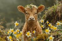Dit prachtige kunstwerk toont de jeugdige nieuwsgierigheid van een kalf te midden van een bloeiend veld narcissen. Met een kleine krans van verse lentebloemen op zijn hoofd staat het symbool voor onschuld en de vernieuwing van het leven die de lente met zich meebrengt. Het levendige geel van de bloemen omringt de zachte, krullende vacht van het kalf en creëert een scène vol warmte en vreugde. Dit schilderij ademt een betoverende sfeer uit en is een aanwinst voor elke kamer en brengt de verfrissende energie van de lente in huis. Ideaal voor natuurliefhebbers en mensen die verlangen naar een landelijke ontsnapping aan de drukte van alledag.