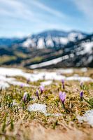 Lentekriebels met krokussen en uitzicht op Oberjoch / Iseler