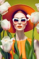 Portret van een vrouw met hoed,zonnebril en tulpen.