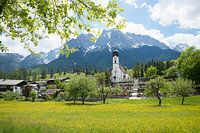 Lentelandschap met bloemenweide in Obergrainau. Kuuroord in Opper-Beieren. Uitzicht op de dorpskerk en het Wetterstein-gebergte.