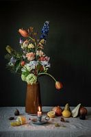 Een levendig en verfijnd stilleven waarin de frisheid van de lente samenkomt met de rijke symboliek van fruit en licht. Het bloemboeket in zachte, frisse tinten (oranje, lila, blauw en geel) staat trots in een hoge, glanzende bruine vaas. Op de tafel eromheen liggen zorgvuldig geplaatste vruchten: een opengesneden peer, citroen, granaatappels en een vijg, die samen een verhaal vertellen van overvloed en vergankelijkheid. Een kleine brandende kaars werpt zacht licht over het geheel, waardoor kleuren en vormen tot leven komen tegen de donkergroene achtergrond. Een harmonieus beeld vol sfeer, balans en detail.