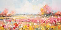 In "Lenteochtend aan de Waterkant" wordt de toeschouwer begroet door een levendige scene die de frisheid van de lente illustreert. De weerspiegeling van water in de onderste helft van het beeld vangt de schoonheid van een kalme ochtend, terwijl de lucht zachtjes verandert van een koele blauwe naar een warme gele gloed, die de komst van de zon aankondigt. De flora is rijk vertegenwoordigd met roze en oranje tinten die afsteken tegen de verfrissende achtergrond van groen en geel. De digitale penseelstreken simuleren de dynamische textuur van olieverf en versterken het gevoel van een momentopname van de ontwakende natuur. Dit werk vangt het moment waarop de wereld ontwaakt, vol belofte en nieuwe groei, en brengt een gevoel van hoop en vernieuwing in elke ruimte waar het wordt geplaatst.
