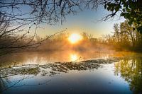 In de Grand Ried in de Elzas komt de zon op en wordt weerspiegeld in het alluviale water.