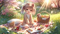 De afbeelding toont een vrolijke anime scène van een zonovergoten lentedag. Het mangapersonage zit op een picknickkleed, omringd door een zee van bloemen en een heerlijke picknick. Haar trouwe pluizige vriend maakt deel uit van dit zorgeloze moment. De scène zou zo uit een lief stripverhaal kunnen komen waarin levensvreugde en eenvoud…