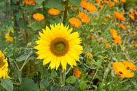 Zonnebloemen en goudsbloemen in de lente