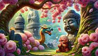 In het hart van een bloeiende tempeltuin zit een jonge monnik, omringd door een explosie van roze kersenbloesems. Zijn lach weerklinkt in de stilte, terwijl een vriendelijk ogende draak nieuwsgierig uit zijn schuilplaats gluurt. Tussen oude, verwrongen boomstammen is een imposant Boeddhabeeld te zien, dat over de actie waakt en vrede…