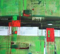 abstracte schilderkunst in groen, modern, structuur, rood en wit, eigentijds, muurschildering voor de praktijk, hotel, woonruimte of kantoor, decoratieve schilderkunst