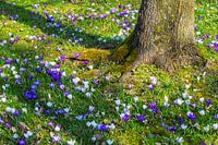 Lenteweide met paarse krokussen