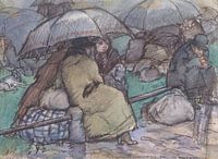 Het schilderij "Vluchtelingen uit België te Roosendaal, 1914" van Leo Gestel toont een groep Belgische vluchtelingen in Roosendaal tijdens het jaar 1914. De scène toont verschillende individuen die samenkomen onder paraplu's, waarschijnlijk op zoek naar beschutting tegen de regen. De figuren zijn gekleed in zware kleding en sommigen…