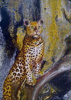 Vloeiende kunst en schilderij: "LEOPARD". De achtergrond is expressionistisch en ik heb het motief naturalistisch geschilderd. De achtergrond is uitvoerig gemaakt met de giettechniek, een speciale manier van schilderen. De speciaal geprepareerde kleur vloeit over het doek. Elk resultaat is uniek en kan niet worden herhaald. De kleuren van het schilderij zijn harmonieus (opzettelijk) op elkaar afgestemd. Dit geeft het aan de ene kant een rustige uitstraling, maar de structuren maken het ook heel levendig. Het eveneens rustig ogende luipaard als hoofdmotief van het kunstwerk is zo ingebed in een bijzondere achtergrond.
