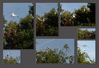 de Lepelaar een fraaie witte vogel met een heel eigen vorm snavel. deze watervogel nestelt hoog in de bomen . in de collage foto's van een boom met daarin drie jongen lepelaars en een reiger nest. De ouder vogel doet pogingen het grote jong te verleiden het nest te verlaten.