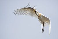 Lepelaar in vlucht met nestmateriaal. Deze lepelaar voert nestmateriaal aan voor het nest hoog in een boom. Mooi om te zien hoe deze grote vogels hun evenwicht moeten bewaren op dunne takken.