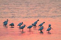 Groep Lepelaars (Platalea leucorodia) rustend in roze gekleurd water.