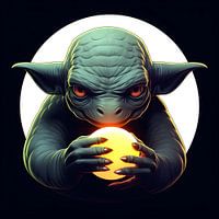 Een duistere fantasiefiguur die op een leprechaun lijkt, is op een realistische maar gestileerde manier afgebeeld terwijl hij met een oranje bal speelt. Het beeldmateriaal bevat iconografische symboliek die de ondeugende aard benadrukt die vaak met leprechauns wordt geassocieerd. De ronde vormen van het kunstwerk zorgen voor een visueel boeiende ervaring.