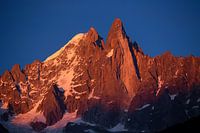 Het laatste zonlicht zet de berg Les Drus in een prachtig rode gloed. Deze spitse rotspunt van graniet ligt boven Argentiere, nabij Chamonix in de franse Alpen.