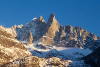 De bergen Les Drus en Aiguille Verte nabij Chamonix in de franse Alpen kleuren prachtig rood als de laatste zonnestralen de granieten rotsen beschijnen.