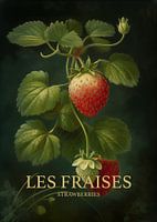 Een prachtige kunstdruk van aardbeien in zachte kleuren. Onderaan staat de tekst "Les Fraises - Aardbeien".