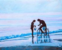 Kinderen bekijken hun vangst aan de vloedlijn van Atlantische kust in avond lichtnet een kalme zeven lange schaduwen.