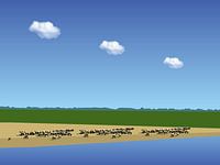 Op de zandvlakte bevindt zich een kudde schapen, herkenbaar aan hun witte en grijze lichamen met donkere koppen. Ze staan in losse groepjes verspreid, sommige grazend, andere rustend. Ondanks de vereenvoudigde, bijna gestileerde tekenstijl, is er voldoende detail om de dieren als schapen te herkennen. De kudde lijkt zich dicht bij het water te bevinden, mogelijk tijdens laagwater, wanneer de uitgestrekte zandbanken vrijkomen.