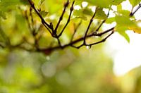 Een sfeervolle scherptediepte foto van een jonge tak met fel groen bladeren tijdens een regenachtige dag. Deze foto is geschoten in een prachtige natuurgebied in Nieuw Zeeland genaamd Jacksons Head wat vlakbij het plaatsje Haast ligt met de beroemde Haast Pass.