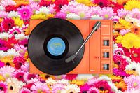 Oranje retro platenspeler uit de jaren zeventig op een achtergrond van bloeiende gerbera's