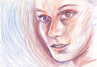 Tekening in kleurpotlood van een vrouw. Een portret waarin contrasterende kleuren zijn gebruikt. Zij heeft een energieke blik en zit vol nieuwe plannen.