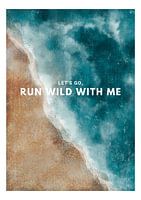 Poster met de titel: "let's go, run wild with me". Sterke witte letters met een illustratie van kust en zee op de achtergrond.