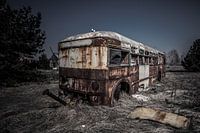 Een foto van mijn geweldige en indrukwekkende reis naar Tsjernobyl in Oekraïne. Deze foto is gemaakt op een terrein met voertuigen.