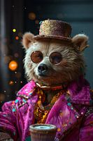 Illustratie van een beer in discokleding uit de jaren 60/70 met verjaardagstaart en confetti.