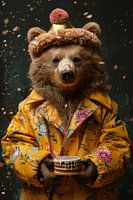 Illustratie van een beer in discokleding uit de jaren 60/70 met verjaardagstaart en confetti.