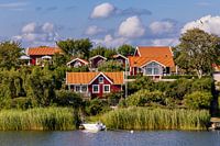 De zuidoostkust van Zweden ligt aan de Oostzee. In de provincie Blekinge, ligt de stad Karlskrona en we vinden daar veel leuke rode zomerhuisjes langs de kust. Hier kijken we over het water naar het recreatieeiland Brändaholm, vlak voor de kust van de stad, wat vol staat met deze typisch rode Zweedse vakantiehuisjes.