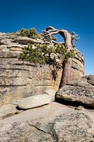 Een eenzame boom leunt tegen een rots op grote hoogte in de Sierra Nevada in Californië. Dit gebied staat ook bekend als klimgebied en wordt Shuteye Ridge genoemd.
