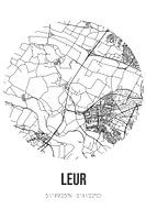 Zwart-witte landkaart, stratenplan of plattegrond van Leur. Leur is gelegen in regio Rivierenland, in de gemeente Wijchen, provincie Gelderland. Op de stadskaart zijn alle openbare wegen in Leur opgenomen. Verder is de kaart voorzien van de coördinaten van het centrum van Leur.