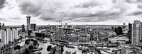 Leuvehaven Rotterdam in zwart wit, met rechts het Martiem Museum. Enkele binnenvaartschepen in stukjes van de Wijnhaven, Bierhaven, Rederijhaven en de Scheepmakershaven. De 215 meter hoge Zalmhaventoren van links is bijna klaar. In het midden aan de Schiedamsedijk is de Cooltower van 154 meter in aanbouw. Op de voorgrond aan de…