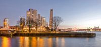 Het parkje op het Leuvehoofd, met oorlogsmonument voor de koopvaardij De Boeg, met op de achtergrond de Boompjes, de Nieuwe Maas, het Noordereiland, de Willemsbrug en De Hef, dit alles gefotografeerd op een koude januarimorgen net voor zonsopkomst.