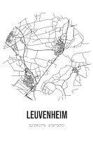 Zwart-witte landkaart, stratenplan of plattegrond van Leuvenheim. Leuvenheim is gelegen in de gemeente Brummen, provincie Gelderland. Op de stadskaart zijn alle openbare wegen in Leuvenheim opgenomen. Verder is de kaart voorzien van de coördinaten van het centrum van Leuvenheim.