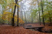 Het Leuvenumse beekje kronkelt door het prachtige mistige herfst gekleurde bos! Door de vele regen staat het water erg hoog en de bomen staan met hun voetjes in het water. De reflectie in het water is als een spiegel.