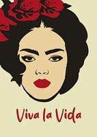 Een geïllustreerde poster van een Latijns meisje met zwart haar en rode rozen in haar haar. Onderaan staat de tekst "Viva la Vida".