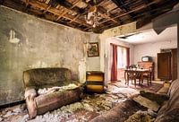 Dit is een foto van een woonkamer in een vervallen en verlaten huis ergens in België. Het huis staat al heel lang leeg en is aan alle kanten open. Helaas geen geschiedenis kunnen vinden om te delen.