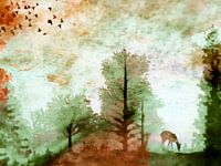 Een abstract landschapschilderij van organische vormen in de stijl van moderne Scandinavische kunst. Dit zeer gedetailleerde kunstwerk is een kunstige fusie van analoge en digitale illustraties in de stijl van Scandinavische kunst.