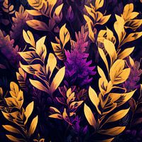 Dit betoverende kunstwerk heeft een oogverblindende reeks gele en paarse bladeren die warmte en levendigheid uitstralen tegen een rijke, donkere achtergrond. De gele bladeren vallen op door hun heldere, zonverlichte effect, terwijl de verstrengelde paarse bloemen en stengels diepte en textuur toevoegen aan de compositie. Het samenspel…