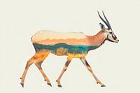 Een majestueus silhouet van een antilope gevuld met levendige landschappen straalt een gevoel van vrijheid en nabijheid tot de natuur uit. De zachte kleuren van de zonsondergang en de harmonieuze compositie maken dit kunstwerk ideaal voor de woonkamer, waar het een ontspannen, creatieve sfeer creëert en de verbeelding stimuleert.
