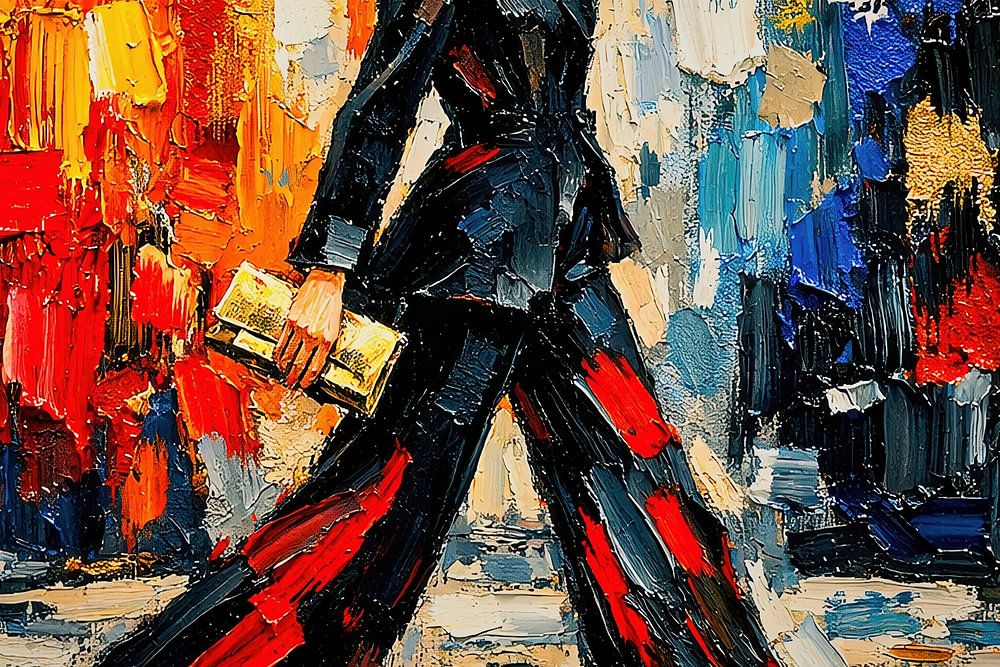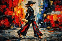 Te midden van dit abstracte kleurengeweld wandelt een figuur in diepzwart: een baken van elegantie en rust. Haar zelfverzekerde…